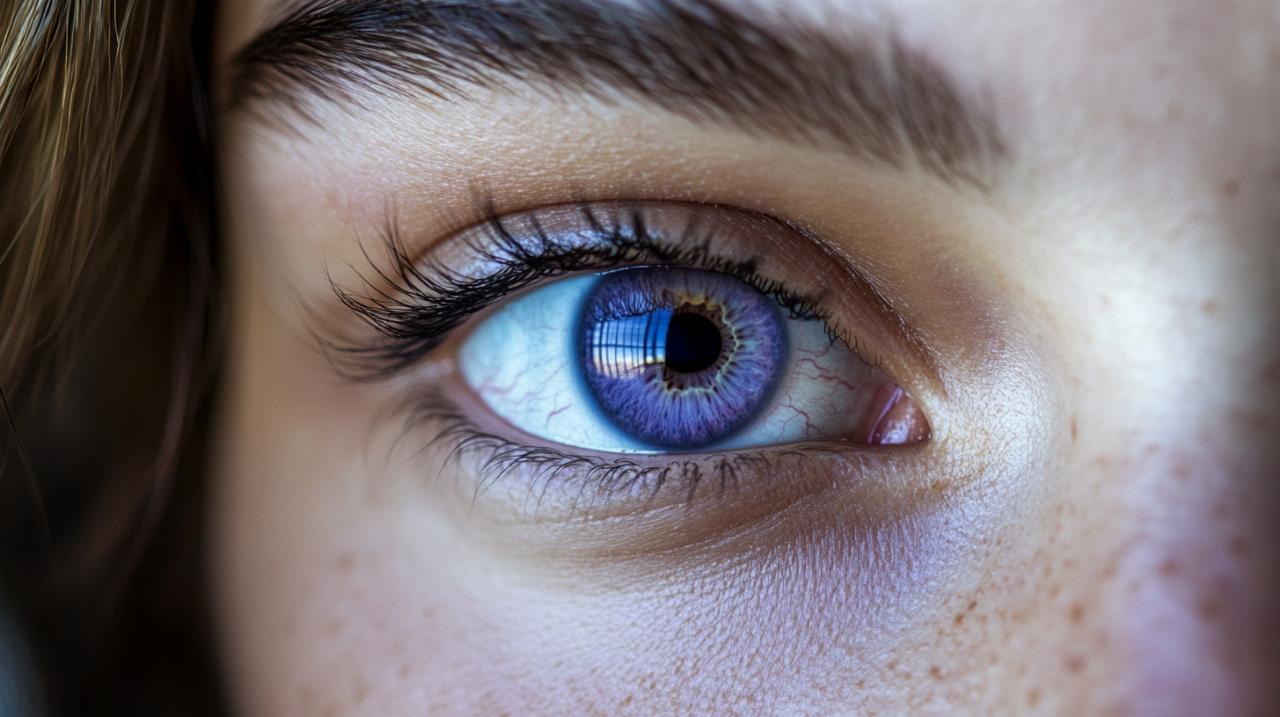 L'apparence violette résulte d'une variation subtile de ce même processus. Lorsque la diffusion de la lumière se combine avec la visibilité des vaisseaux sanguins sous-jacents, qui apportent une composante rouge, le cerveau interprète le mélange optique comme une teinte violette. Cette perception dépend fortement de la structure spécifique de l'iris et de l'épaisseur des différentes couches tissulaires. Les variations individuelles dans ces paramètres expliquent pourquoi certaines personnes présentent des yeux apparaissant davantage violets que d'autres, même avec des niveaux de mélanine comparables.